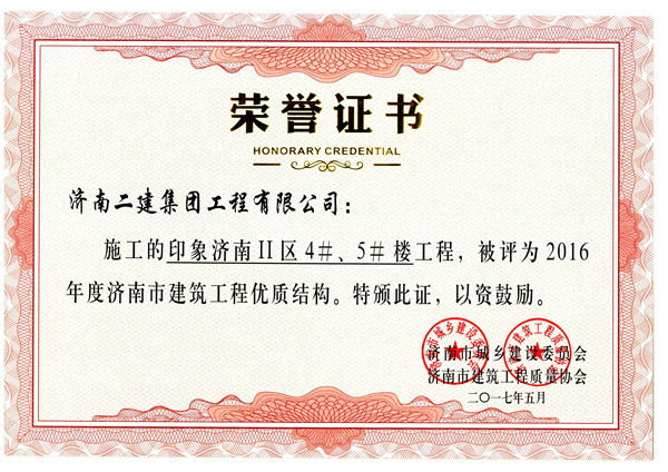 印象濟(jì)南II區(qū)4、5#被評(píng)為2016年度濟(jì)南市建筑工程優(yōu)質(zhì)結(jié)構(gòu)